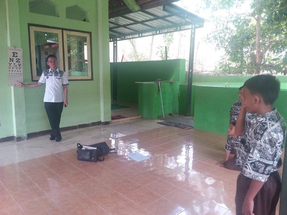 Petugas Pusat Kesehatan Masyarakat (Puskesmas) (kiri), membimbing pelajar (kanan) melakukan tes kesehatan mata di Mushola SMPN 8 Kabupaten Batang, Rabu (13/11/2019). Petugas Puskesmas Susanto menuturkan, tes ini dilakukan untuk mengetahui ketajaman mata anak dari jarak lima meter. Jika pada ukuran huruf tertentu berarti ia mengalami rabun jauh. MC Batang, Jateng/Heri/Ardhy