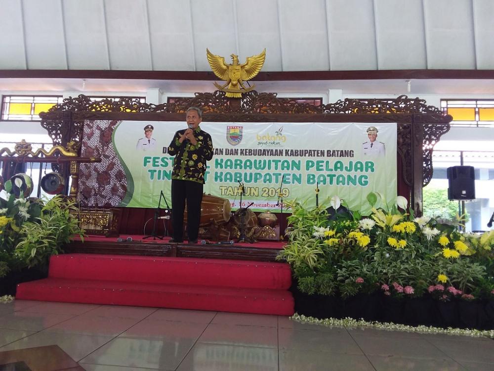 Kepala Dinas Pendidikan dan Kebudayaan Kabupaten Batang Achmad Taufiq, memberikan sambutan dalam Lomba Karawitan Pelajar di Pendopo Kabupaten Batang, Sabtu (16/11/2019). Taufiq mengatakan, lomba karawitan ini bisa mendukung visi misi Bupati Batang yaitu seni budaya yang energik dan berdaya saing di kancah nasional. MC Batang, Jateng/Heri/Ardhy