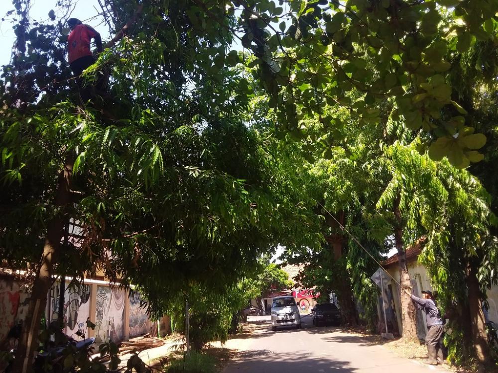 Sejumlah petugas Dinas Pekerjaan Umum dan Penataan Ruang (DPUPR) Kabupaten Batang, mamangkas dahan pohon di kawasan Dracik Kampus, Kelurahan Proyonanggan Selatan, Kabupaten Batang, Senin (18/11/2019). Pelaksana Urusan Jalan DPU-PR Kabupaten Batang Slamet mengatakan pemangkasan dilakukan hanya pada pohon yang rawan tumbang saat musim penghujan di 49 titik ruas jalan. MC Batang, Jateng/Heri/Ardhy