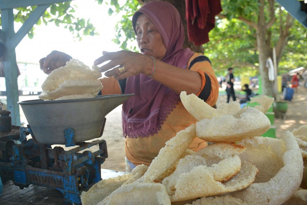 Seorang pedagang, menjual intip atau kerak nasi goreng di Wisata Pantai Ujung Negoro, Kecamatan Kandeman, Kabupaten Batang, Minggu (17/11/2019). Intip goreng dijual dengan harga Rp16.000,00/Kg. MC Batang, Jateng/Jumadi/Ardhy