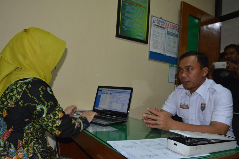 Petugas Rumah Sakit Umum Daerah (RSUD) Kabupaten Batang (kiri), memeriksa kesehatan Bupati Batang Wihaji (kanan) saat Customer Gathering di Klinik Umum RSUD Kabupaten Batang, Rabu (20/11/2019). Bupati Batang mengatakan pemeriksaan ini bertujuan untuk memastikan pelayanan RS benar-benar baik atau tidak. MC Batang, Jateng/Jumadi/Ardhy