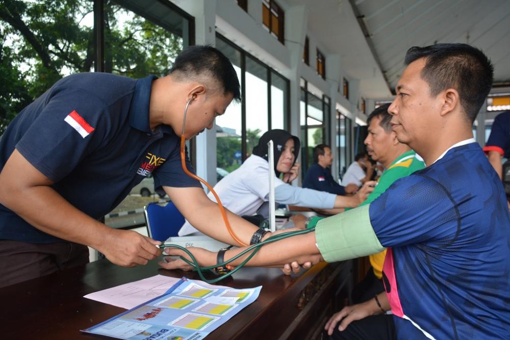 Petugas Dinas Kesehatan Kabupaten Batang (kiri), memeriksa tekanan darah Aparatur Sipil Negara Kabupaten Batang dalam memperingati Hari Kesehatan Nasional di Pendopo Kabupaten Batang, Jumat (22/11/2019). Kegiatan ini diikuti seluruh pejabat eselon II dan III di lingkungan Pemerintah Kabupaten Batang. MC Batang, Jateng/Jumadi/Ardhy
