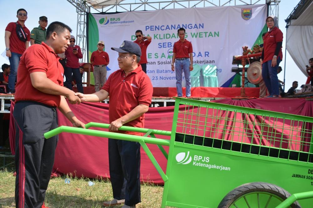 Kepala Dinas Ketenegakerjaan Kabupaten Batang Tulyono (kanan), memberikan bantuan gerobak sampah saat pencanangan Desa Klidang Wetan sebagai desa sadar jaminan sosial ketenagakerjaan di Lapangan Klidang Wetan, Kecamatan Batang, Kabupaten Batang, Sabtu (23/11/2019). Bantuan sejumlah dua buah gerobak sampah diberikan kepada Desa Klidang Wetan dengan harapan dapat bermanfaat untuk ke depannya. MC Batang, Jateng/Jumadi/Ardhy