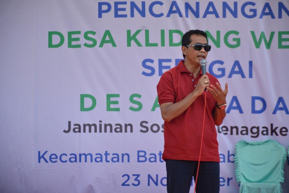 Wakil Bupati Batang Suyono, memberikan sambutan saat pencanangan Desa Klidang Wetan sebagai desa sadar jaminan sosial ketenagakerjaan di Lapangan Klidang Wetan, Kecamatan Batang, Kabupaten Batang, Sabtu (23/11/2019). Wabup Batang mengatakan Badan Penyelenggara Jaminan Sosial Ketenagakerjaan merupakan bagian terpenting dalam tatanan kehidupan karena dapat memproteksi jiwa manusia.