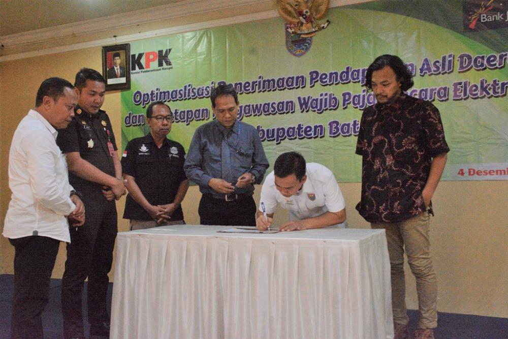 Bupati Batang Wihaji (kedua kanan) menandatangani komitmen bersama optimalisasi wajib pajak dalam Sosialisasi Optimalisasi Penerimaan pendapatan asli daerah dan penetapan pengawasan wajib pajak secara elektronik di Hotel Sendang Sari, Kabupaten Batang, Rabu (4/12/2019). Komitmen bersama optimalisasi wajib pajak ini ditanda tangani oleh Bupati Batang, Kejaksaan Negeri Batang, Polres Batang, Bank Jateng, dan Perwakilan Pengusaha. Komitmen Bersama ini bertujuan agar pendapatan asli daerah kabupaten batang dapat meningkat untuk kedepannya. MC Batang/Jateng/Roza.