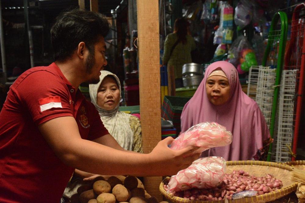 Seorang petugas satgas makanan dan obat (kiri), memberikan edukasi kerupuk yang berbahaya ke pedagang (kanan) saat pengawasan dan pembinaan makanan dan obat di Pasar Tradisonal, Kabupaten Batang, Selasa (17/12/2019). Petugas satgas mengatakan, kerupuk yang berbahaya mempunyai ciri antara lain, warnanya cerah mengkilap dan lebih mencolok, terkadang warna terlihat tidak rata, dan bila dikonsumsi rasanya sedikit lebih pait. MC Batang, Jateng/Roza/Jumadi