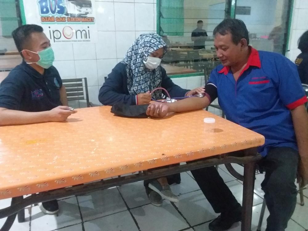 Seorang pengemudi bus (kanan), melakukan pemeriksaan tekanan darah yang diselenggarakan oleh Badan Narkotika Nasional Batang di Rumah Makan Pantura, Kabupaten Batang, Kamis (26/12/2019). Petugas kesehatan mengatakan, jika kondisi tubuh kurang sehat dokter akan memberikan vitamin atau penangan lebih lanjut agar kembali sehat sebelum membawa penumpang. MC Batang, Jateng/Heri/Jumadi