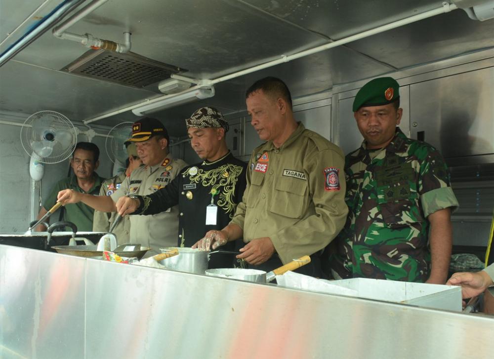 Bupati Batang Wihaji (tengah), memasak didapur umum bersama forkopimda saat Apel Siaga Bencana di Jalan Veteran Kabupaten Batang, Rabu (8/1/2020). Dapur umum berfungsi sebagai tempat pengolahan makanan untuk di distribusikan kepada korban bencana dengan kapasitas 1.500 porsi makanan sekali masak. MC Batang, Jateng/Roza/Jumadi