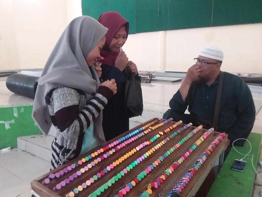 Dua orang pembeli (kiri), mencoba aroma parfum saat Bazar Buku Murah, yang digelar dari tanggal 10-19 Januari 2020 di Gedung Wanita Kabupaten Batang, Jumat (10/1/2020). Penjual mengatakan, harga parfum ukuran 8 ml dijual dengan harga Rp8.000,00. MC Batang, Jateng/ Heri/Jumadi