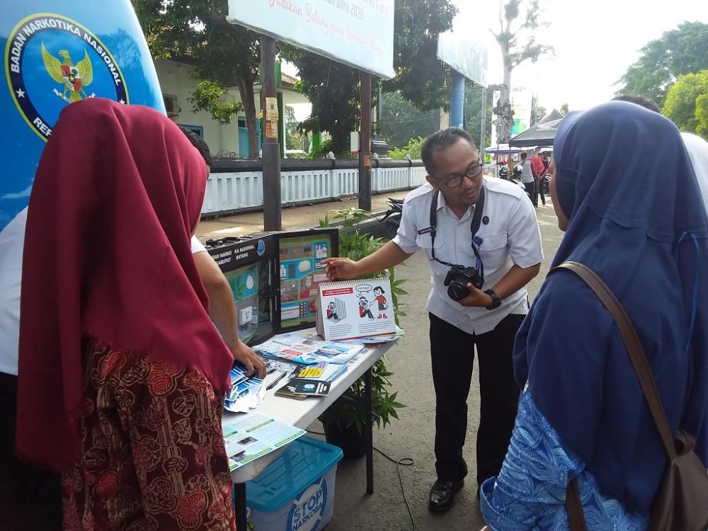 Seorang petugas Badan Narkotika Nasional Batang (tengah), mensosialisasikan tentang bahaya penyalahgunaan narkotika saat event Kliwonan di Alun-alun Kabupaten Batang, Kamis (13/2/2020). Kepala BNN Batang AKBP. Windarto mengatakan, BNN memanfaatkan event Kliwonan, karena tempat yang strategis, sehingga lebih mudah menyampaikan pesan pencegahan pemberantasan penyalahgunaan peredaran gelap Narkoba di kalangan umum. MC Batang, Jateng/Heri/Jumadi