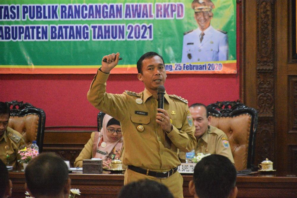 Bupati Batang Wihaji, memberikan sambutan dalam forum konsultasi publik Rancangan Kerja Pembangunan Daerah (RKPD) di Aula Bupati, Kabupaten Batang, Selasa (25/2/2020). Bupati Batang mengatakan, RKPD bagian dari proses awal perencanaan yang akan dilakukan dengan konsultasi publik untuk menentukan kebijakan yang harus dikerjakan berdasarkan masukan sekaligus perencanaan yang sudah ditetapkan oleh Pemda Kabupaten Batang. MC Batang, Jateng/Roza/Jumadi