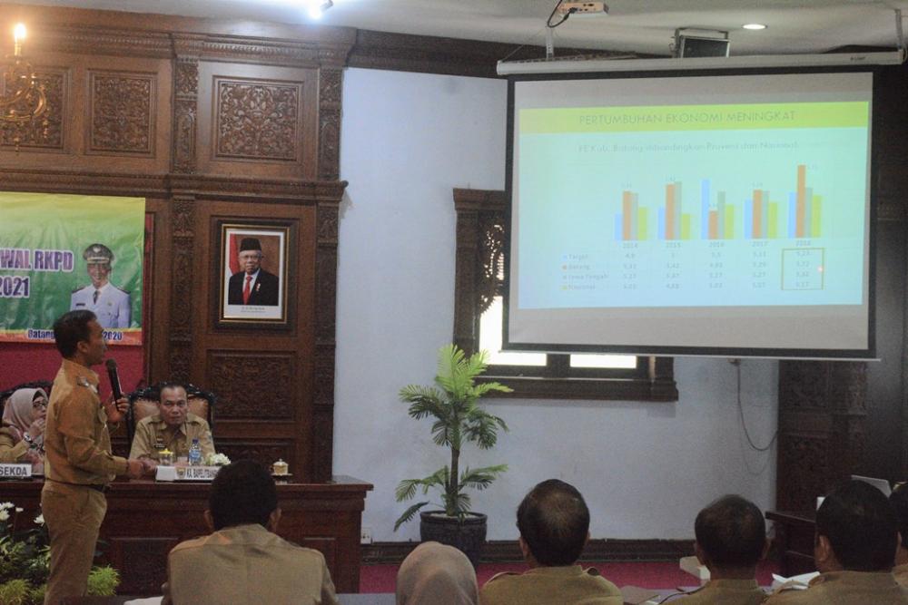 Bupati Batang Wihaj (kiri), menujukkan statistik pertumbuhan ekonomi Pemerintah Kabupaten (Pemkab) Batang dengan Provinsi Jawa Tengah dan Nasional dalam forum konsultasi publik Rancangan Kerja Pembangunan Daerah (RKPD) di Aula Bupati, Kabupaten Batang, Selasa (25/2/2020). Pertumbuhan Ekonomi Pemkab Batang Tahun 2018 yaitu 5,72 dibandingkan dari target 5,23, Provinsi Jawa Tengah 5,32, dan Nasional 5,17. MC Batang, Jateng/Roza/Jumadi