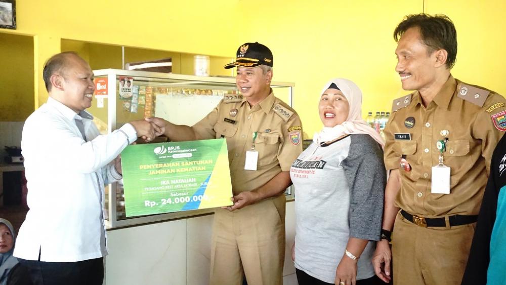 Kepala Kantor Cabang BPJAMSOSTEK Batang, Bambang Indriyanto (kiri), memberikan santunan kematian senilai Rp24 juta kepada Camat Subah Wahyoe Setyo Oetomo (ketiga kanan) di Rumah Makan Putri Tunggal, Kecamatan Subah, Kabupaten Batang, Senin (2/3/2020). Wahyoe Setyo mengatakan, ini sangat terbukti sekali bahwa BPJAMSOSTEK bisa mencairkan Jaminan Kematian senilai Rp24 juta, sehingga ini juga sangat terbukti terkait kesejahteraannya dan membuat rasa aman dan nyaman warga Desa Jatisari untuk melakukan pekerjaan sehari-hari. MC Batang, Jateng/Jumadi