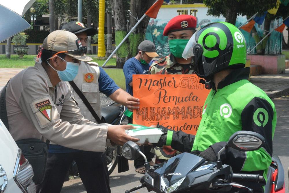 Seorang petugas (kiri), membagikan nasi kotak dalam aksi bersama melawan wabah Covid-19 di Alun-Alun Kabupaten Batang, Minggu (5/4/2020). Kegiatan ini merupakan dari penggalangan dana dilakukan oleh pemuda muhamnadiyah bersama kokam kandeman untuk membantu kepada orang tidak mampu dengan membagikan 150 nasi kotak untuk tukang becak, tukang parkir, dan ojek online. MC Batang, Jateng/Roza/Jumadi