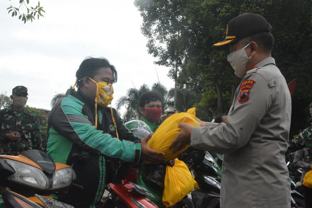 Inspektur Pengawas Daerah (Irwasda) Polda Jawa Tengah, Kombes Pol Budi Yuwono (kanan), menyerahkan bantuan kepada pengemudi ojek online di Kawasan Alun-alun Kabupaten Batang, Rabu (15/4/2020). Kombes Pol Budi Yuwono mengatakan, 690 paket sembako dan 200 masker diberikan kepada ojek online, tukang becak dan masyarakat, yang memang mata pencahariannya berkurang. MC Batang, Jateng/Hasan/Jumadi
