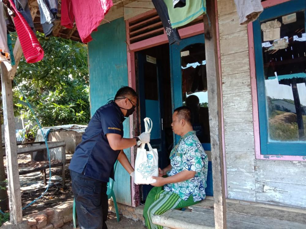 Kepala Badan Narkotika Nasional Kabupaten Batang AKBP Windarto (kiri), memberikan paket sembako kepada warga, di Desa Denasri Kabupaten Batang, Jumat (24/4/2020). Windarto mengatakan, 50 paket sembako dibagikan agar berkah Ramadan dapat dirasakan masyarakat yang membutuhkan di tengah pandemi Covid-19. MC Batang, Jateng/Heri/Jumadi