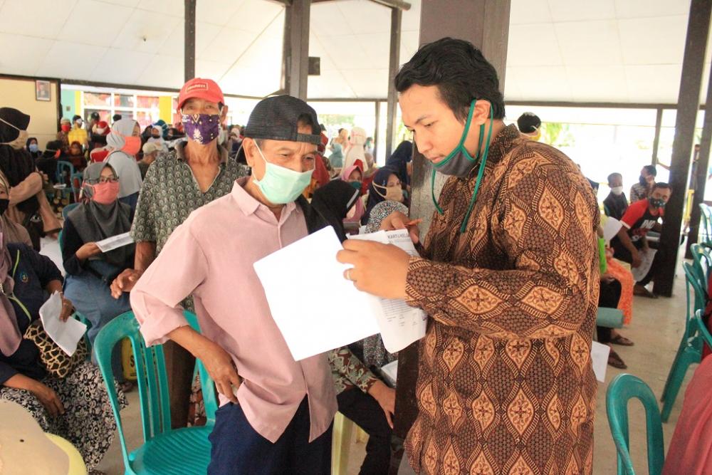 Seorang petugas (kanan), melakukan cek kelengkapan persyaratan pengambilan Bantuan Sosial Tunai (BST) di Pendopo Kecamatan Batang, Kabupaten Batang, Minggu (17/5/2020). Seorang petugas untuk stanby di masing-masing tempat penerimaan BST guna mempercepat proses verifikasi. MC Batang, Jateng/Hasan/Jumadi