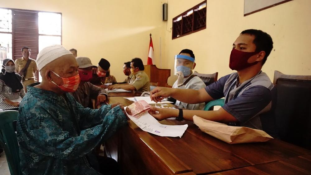 Seorang petugas (kanan), menyerahkan Bantuan Sosial Tunai (BST) senilai Rp300.000,00 di Pendopo Kecamatan Bandar, Kabupaten Batang, Senin (18/5/2020). Petugas mengatakan, ada 496 Kepala Keluarga yang mendapatkan BST dari 7 desa. MC Batang, Jateng/Jumadi