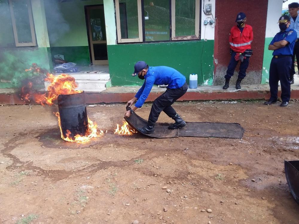 Seorang staf Rutan Kelas IIB Kabupaten Batang (kiri), mempraktikkan teknik memadamkan api menggunakan karung goni di Kawasan Kebun Rutan Kelas IIB Kabupaten Batang, Kamis (16/7/2020). Kepala Rutan Kelas IIB Batang Rindra Wardhana berharap, setelah para staf mendapat pelatihan langsung dari Damkar, mereka tidak memiliki keraguan lagi dalam mengambil tindakan jika terjadi sesuatu. MC Batang, Jateng/Fristinia/Jumadi