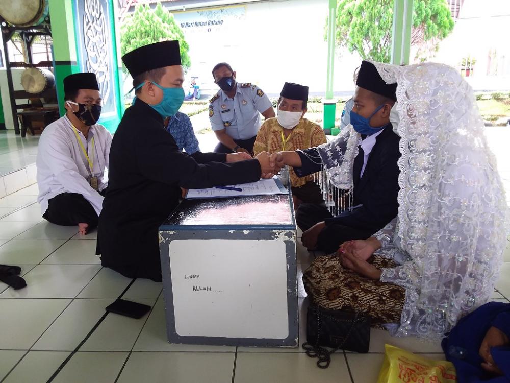 Seorang Warga Binaan Pemasyarakatan (kanan), melakukan akad nikah di Masjid At-Taubah Rutan Kelas IIB Kabupaten Batang, Kamis (23/7/2020). Kepala Rutan Rindra Wardhana menyampaikan, prosesi akad nikah menerapkan protokol kesehatan dan hanya diikuti 10 orang dari keluarga inti. MC Batang, Jateng/Heri/Jumadi