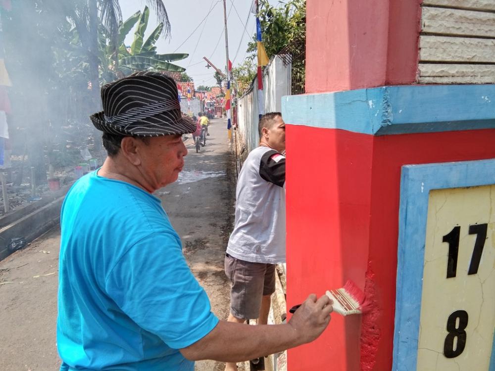 Seorang warga (kiri), mengecat gapura dalam Peringati Hari Ulang Tahun Republik Indonesia ke-75 di Gang Jalak Kelurahan Proyonanggan Tengah, Kecamatan Batang, Kabupaten Batang, Sabtu (8/8/2020). Seorang panitia mengatakan, menghias gapura untuk menyambut HUT ke-75 RI dengan mengecat, mengganti tahun pada gapura dan memasang lampu untuk menambah keindahan. MC Batang, Jateng/Roza/Jumadi