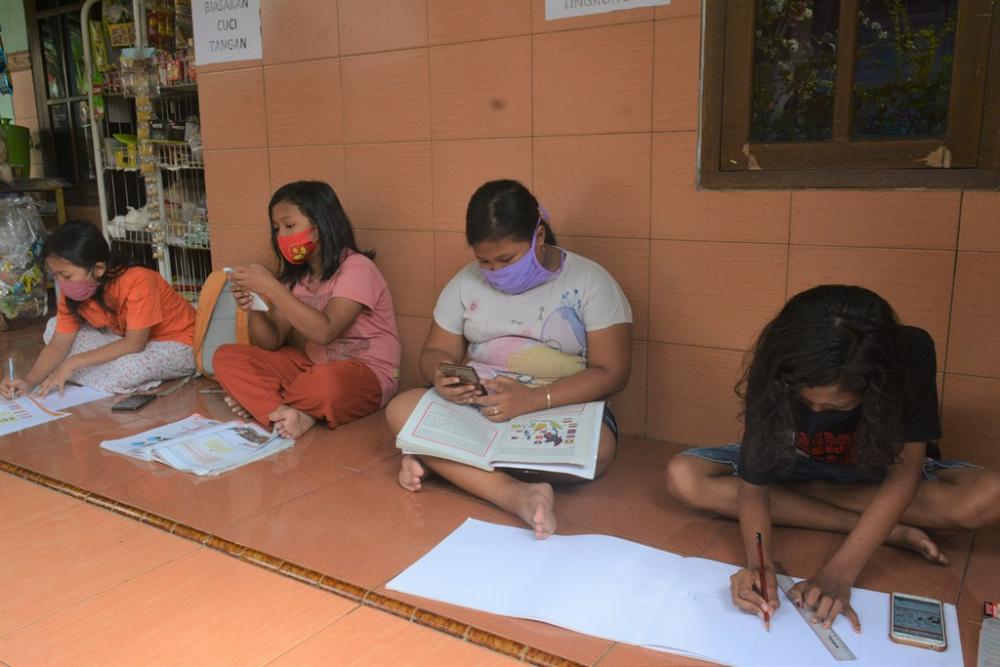 Sejumlah anak, melakukan belajar online bersama di Dukuh Kebonan, Kelurahan Proyonanggan Utara, Kecamatan Batang, Kabupaten Batang, Kamis (13/8/2020). Ketua Rukun Tetangga (RT) 4 Slamet Sugiarto mengatakan, anak-anak belajar online dengan memanfaatkan sarana wifi gratis, adapun waktu kita batasi untuk jam pembelajaran mulai pukul 07.00 WIB hingga 13.00 WIB. MC Batang, Jateng/Roza/Jumadi