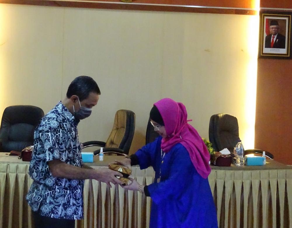 Sekretaris Daerah Kabupaten Karanganyar Sutarno (Kiri) berikan Plakat kepada Pj Sekda Kabupaten Batang Lani Dwi Rejeki (kanan) saat Kunjungan Kerja Kabupaten Karangnyar di Gedung Mal Pelayanan Publik (MPP) Kabupaten Batang, Selasa (8/9/2020). Plakat tersebut sebagai kenang-kenangan dan rasa hormat dari Kabupaten Karanganyar kepada MPP Kabupaten Batang. MC Batang, Jateng/Umr/Jumadi