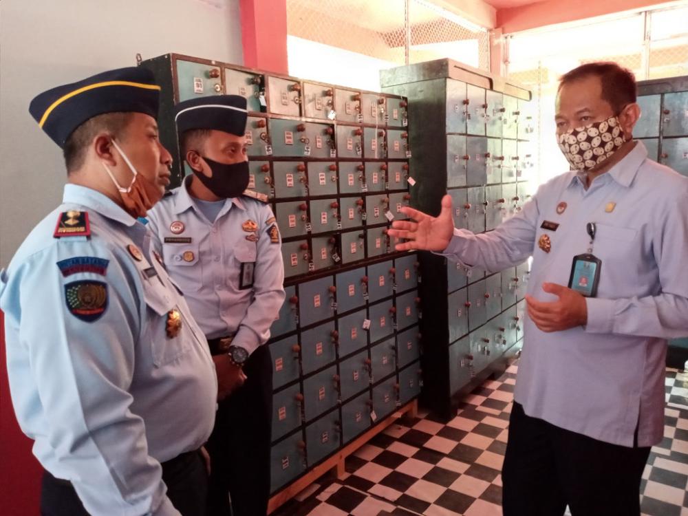 Kepala Kanwil Kemenkumham Jawa Tengah Priyadi (kanan), meninjau ruang penitipan barang di Rutan Kelas IIB, Kabupaten Batang, Senin (14/9/2020). Priyadi mengatakan, semua pengunjung hanya diperbolehkan membawa barang yang akan diberikan kepada Warga Binaan Pemasyarakatan, sedangkan milik pribadi seperti tas, dompet, jaket dan lainnya dititipkan di loker penitipan. MC Batang, Jateng/Heri/Jumadi