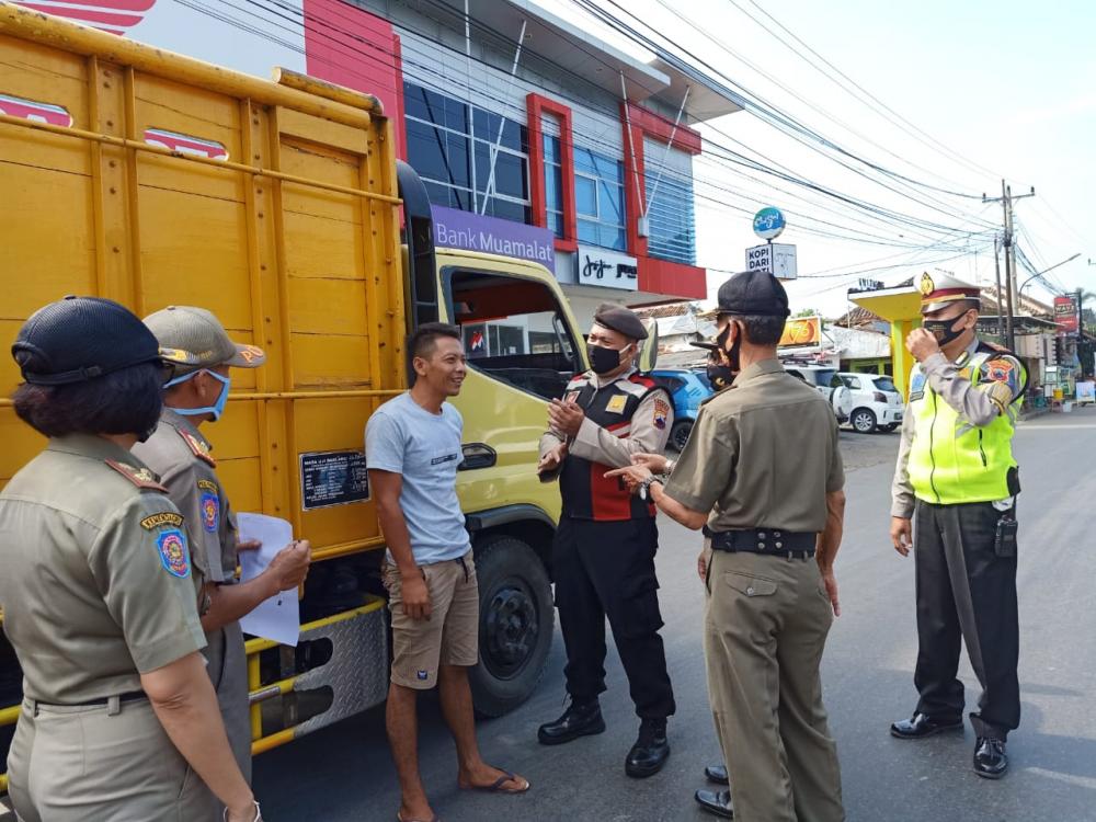 Seorang Petugas (ketiga kanan), memberikan sanksi sosial kepada seorang supir truk (ketiga kiri) dalam kegiatan operasi yustisi Kabupaten Batang di Alun-Alun Kabupaten Batang, Senin (14/9/2020). Kepala Bagian Ops Polres Batang, AKP Asfauri mengatakan, operasi Yustisi merupakan tahapan pemberian sanksi setelah dilakukannya sosialisasi sebagai implementasi Inpres No. 6 Tahun 2020 dan Peraturan Bupati No. 55 Tahun 2020, tentang disiplin protokol kesehatan. MC Batang, Jateng/Roza/Jumadi