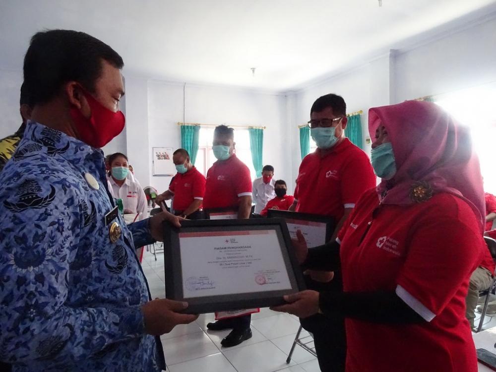 Bupati Batang Wihaji (kiri) memberikan piagam penghargaan secara simbolis kepada pendonor darah sukarela Eminingsih (kanan) di Gedung Palang Merah Indonesia (PMI) Kabupaten Batang, Kamis (17/09/2020). Penghargaan diberikan kepada pendonor sukarela yang sudah mendonorkan darahnya ke 25 kali. MC Batang, Jateng/Umr/Jumadi