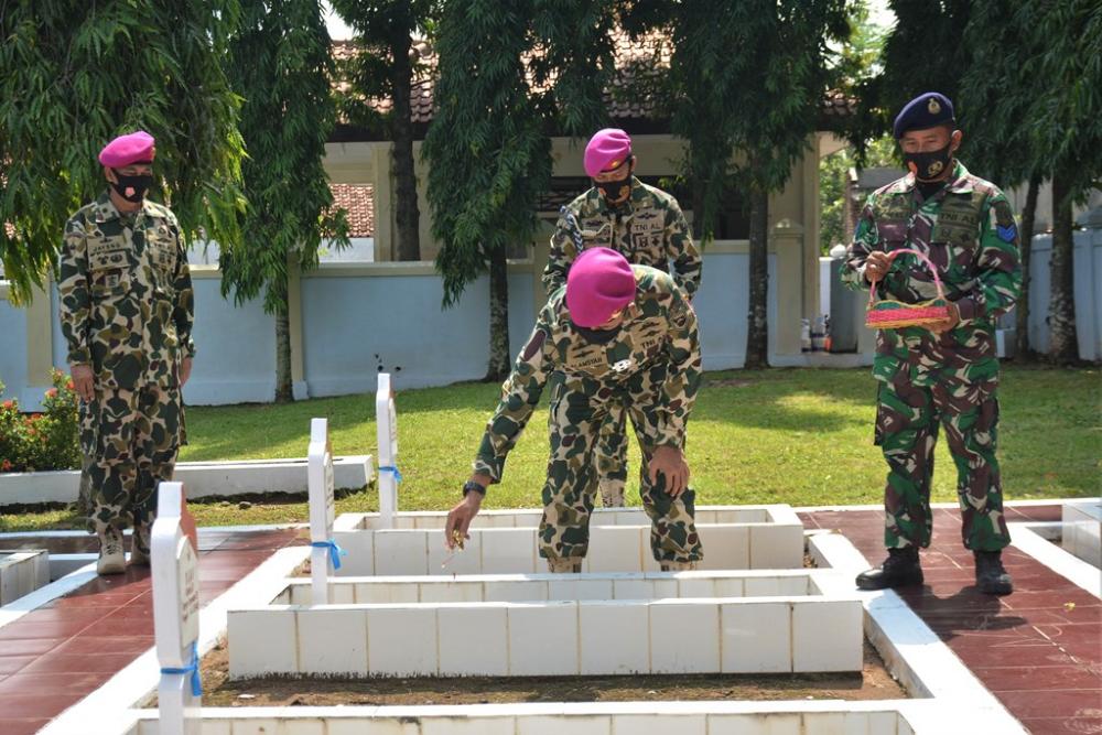 Wakil Komandan Korps Marinir Brigadir Jenderal TNI (Mar) Nur Alamsyah (tengah), menaburkan bunga untuk prajurit yang telah gugur dalam kujungan dan ziarah Korps Marinir di Taman Makam Pahlawan Kadilangu Kabupaten Batang, Selasa (10/11/2020). Wakil Komandan Korps Marinir Brigadir Jenderal TNI (Mar) Nur Alamsyah mengatakan, penaburan bunga bentuk Korps Marinir untuk mengenang pertempuran para pahlawan Korps Komando Angkatan Laut, karena banyak prajurit yang gugur di laut Brebes, Tegal, Pekalongan, dan Batang. MC Batang, Jateng/Roza/Jumadi