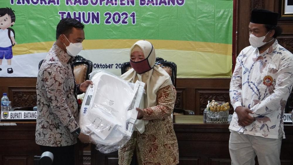 Bupati Batang Wihaji (kiri), memberikan alat antropometri saat Rembug Stunting di Aula Bupati, Kabupaten Batang, Kamis (21/10/2021). Alat antropometri diberikan untuk 105 desa yang ada di Kabupaten Batang. Alat tersebut digunakan untuk mengetahui permasalahan yang berhubungan dengan kondisi tubuh anak stunting atau kerdil. MC Batang, Jateng/Roza/Jumadi