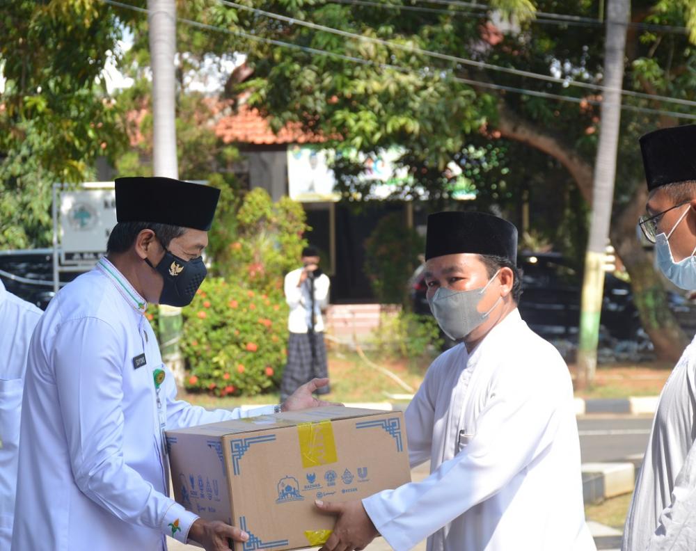 Wakil Bupati Batang Suyono (kiri), menyerahkan bantuan perlengkapan pencegahan COVID-19 dari kanwil Kementrian Agama (Kemenag) Provinsi Jawa Tengah kepada perwakilan pondok pesantren Kabupaten Batang usai Upacara Hari Santri di halaman Pendopo, Kabupaten Batang, Jumat (22/10/2021). Bantuan perlengkapan tersebut diberikan kepada empat perwakilan pondok pesantren dalam rangka mendukung disiplin protokol kesehatan untuk pencegahan COVID-19. MC Batang, Jateng/Harist/Jumadi