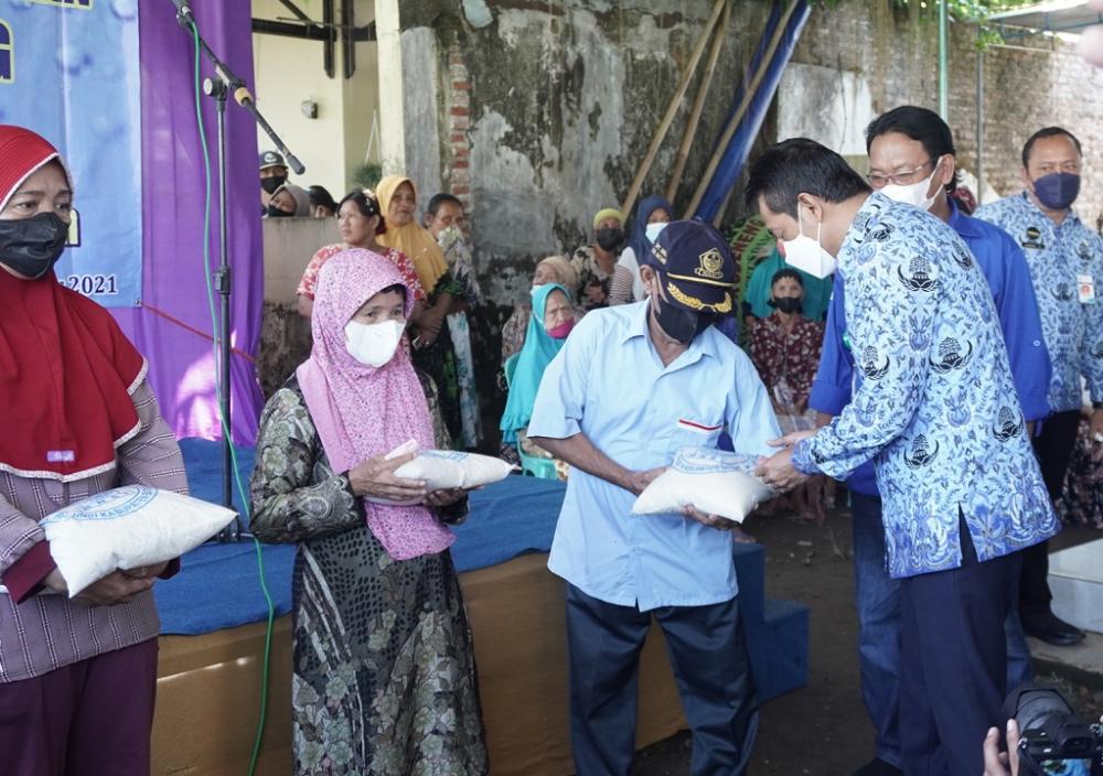 Wakil Bupati Batang Suyono (kanan), membagikan beras kepada nelayan saat pembagian beras paceklik di Kantor KUD Ngupoyo Moni, Kelurahan Karangasem Utara, Kabupaten Batang, Rabu (17/11/2021). Pembagian beras paceklik dibagikan kepada nelayan aktif dan jompo yang masing-masing mendapat 4 kg. MC Batang, Jateng/Roza/Jumadi
