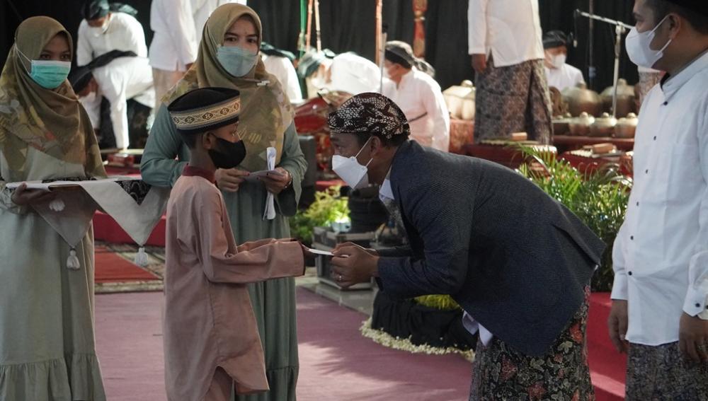 Bupati Batang Wihaji (kedua kanan), memberikan santunan kepada anak yatim piatu di Pendopo Kabupaten Batang, Rabu (24/11/2021). Santunan diberikan kepada 25 anak yatim piatu di seluruh wilayah Kabupaten Batang dalam rangka pengajian kebangsaan secara virtual. MC Batang, Jateng/Roza/Jumadi