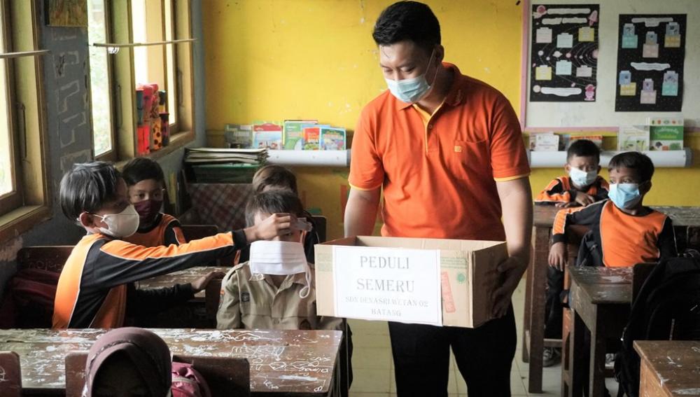 Seorang siswa (kiri), memasukkan uang sebagai bentuk penggalangan dana peduli Semeru yang akan disalurkan melalui Palang Merah Indonesia (PMI) Kabupaten Batang di Ruang Kelas SD Negeri 2 Denasri Wetan, Kecamatan Batang, Kabupaten Batang, Jumat (10/12/2021). Penggalangan dana yang diberikan para siswa yaitu uang, mie instan, makanan ringan, shampoo, sabun, susu dan pembalut. MC Batang, Jateng/Roza/Jumadi