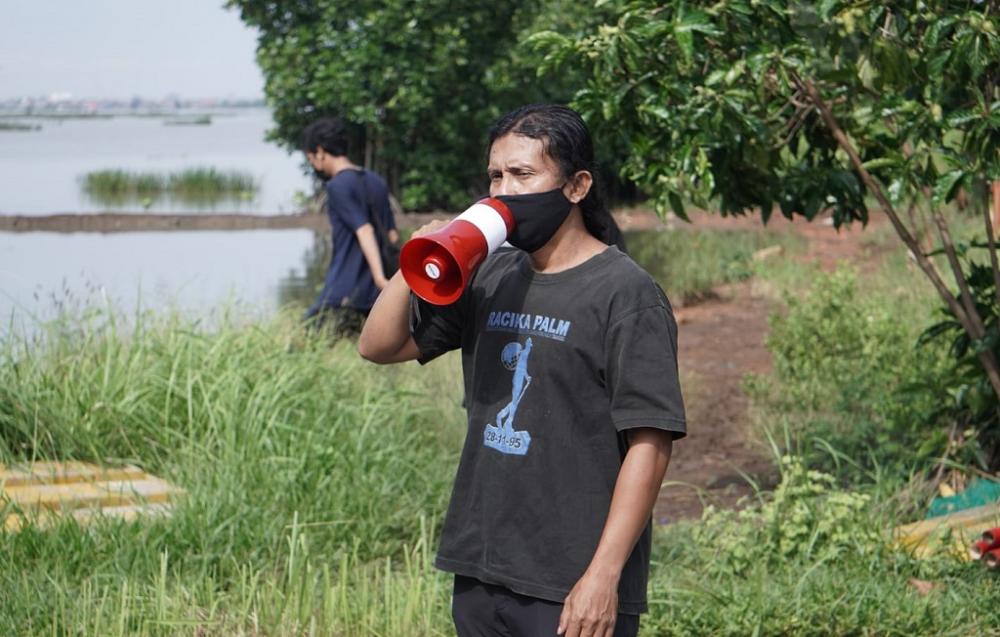 Seorang pecinta alam Suwong, memberikan sambutan saat Penanaman Mangrove di Pantai Denasri Wetan, Kecamatan Batang, Kabupaten Batang, Minggu (12/12/2021). Penanaman ini merupakan bentuk kampanye penolakan pecinta alam agar daratan di Batang tidak tenggelam, karena saat ini air laut sudah sampai persawahan Denasri Wetan. MC Batang, Jateng/Roza/Jumadi