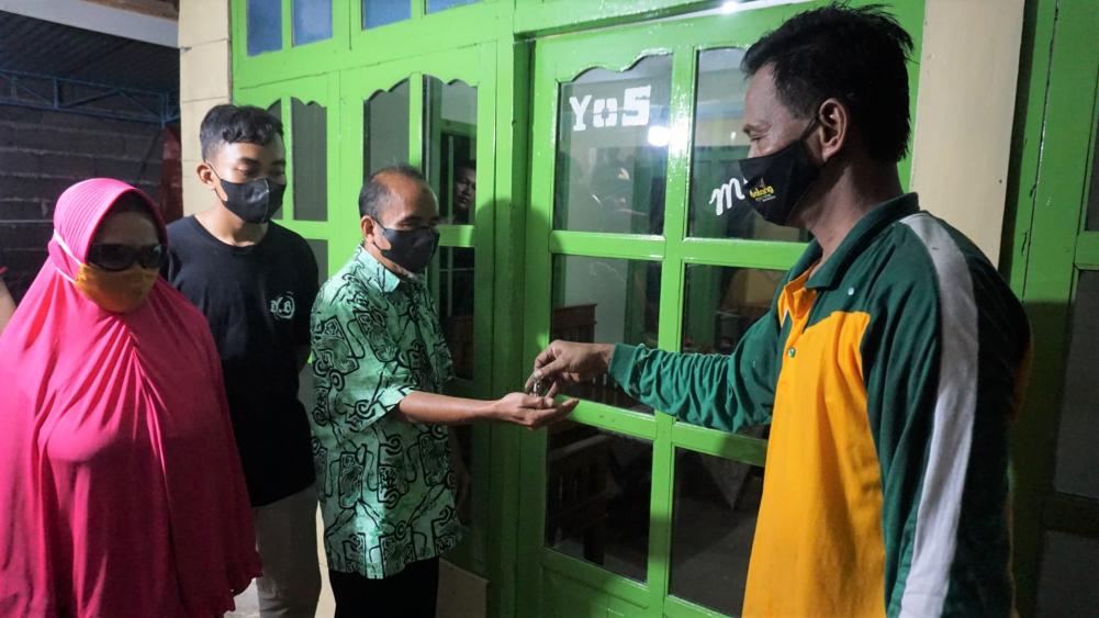 Kepala Bagian Protokol dan Komunikasi Pimpinan Kabupaten Batang Tatang Nur Adrenalinda (kanan), menyerahkan kunci kepada Suroso selaku pemilik rumah (dua kanan) dalam program Bedah Rumah Peringatan Hari Ulang Tahun Ke-50 Korps Pegawai Republik Indonesia di Desa Banaran, Kecamatan Banyuputih, Kabupaten Batang, Selasa (14/12/2021). Suroso mengaku bersyukur rumahnya sudah diperbaiki, karena dahulu rumahnya memang kurang layak huni sebab dinding dan kayunya sudah banyak yang keropos. MC Batang, Jateng/Ardhy/Jumadi