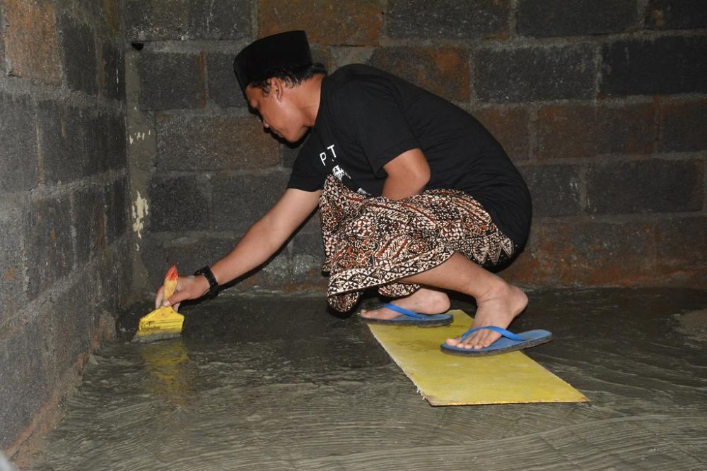 Bupati Batang Wihaji, menghaluskan plester lantai atau tembok dengan semen bercampur air rumah salah satu warga dalam program Bedah Rumah Peringatan Hari Ulang Tahun Ke-50 Korps Pegawai Republik Indonesia di Desa Selopajang Timur, Kecamatan Blado, Kabupaten Batang, Selasa (14/12/2021). Bupati Batang mengatakan, kegiatan ini sebagai bentuk keguyubrukunan antar Aparatur Sipil Negara (ASN) dalam melayani masyarakat dengan anggaran berasal dari iuran para ASN se-Kabupaten Batang. MC Batang, Jateng/Jumadi