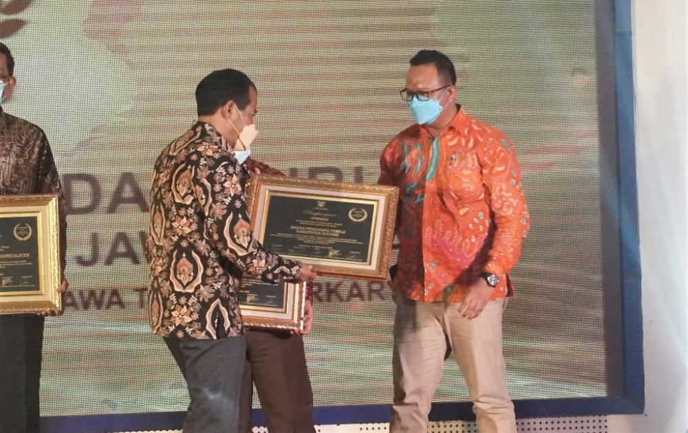 Ketua Komisi Informasi (KI) Romadus Ndau (kiri), memberikan penghargaan Keterbukaan Informasi Publik (KIP) Award 2021 kepada Bawaslu Batang di Gedung Universitas Dian Nuswantoro (UDINUS) Semarang, Selasa (14/12/2021). Bawaslu Kabupaten Batang mendapatkan penghargaan KIP award 2021 dalam kategori Website Informatif Kelompok Komisi Pemilihan Umum (KPU) dan Bawaslu Kabupaten dan Kota. MC Batang, Jateng/Roza/Jumadi