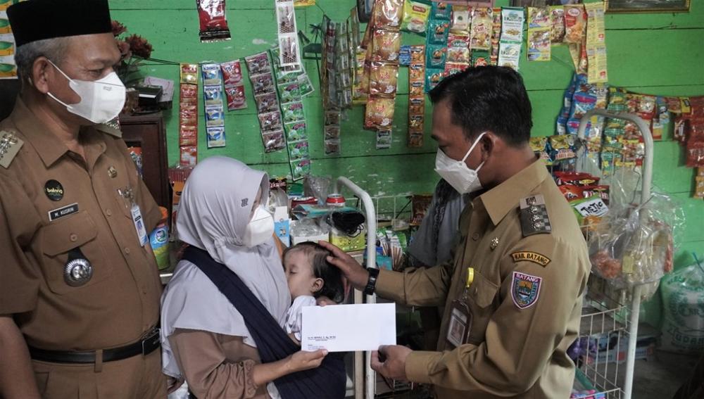 Bupati Batang Wihaji (kanan), memberikan bantuan uang tunai saat melakukan kunjungan kerja di Desa Kandeman, Kecamatan Kandeman, Kabupaten Batang, Selasa (28/12/2021). Bupati Batang memberikan bantuan uang tunai sebesar Rp5.000.000,00 untuk pengobatan seorang Balita yang mempunyai kelainan jantung. MC Batang, Jateng/Roza/Jumadi