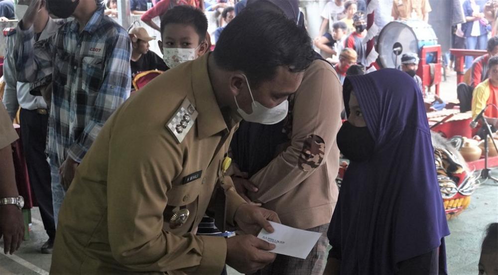 Bupati Batang Wihaji (kiri), memberikan santunan kepada anak yatim saat melakukan kunjungan kerja di Desa Tegalombo, Kecamatan Tersono, Kabupaten Batang, Selasa (28/12/2021). Santunan anak yatim Desa Tegalombo ada 14 orang yang masing-masing mendapatkan Rp300.000,00. MC Batang, Jateng/Roza/Jumadi