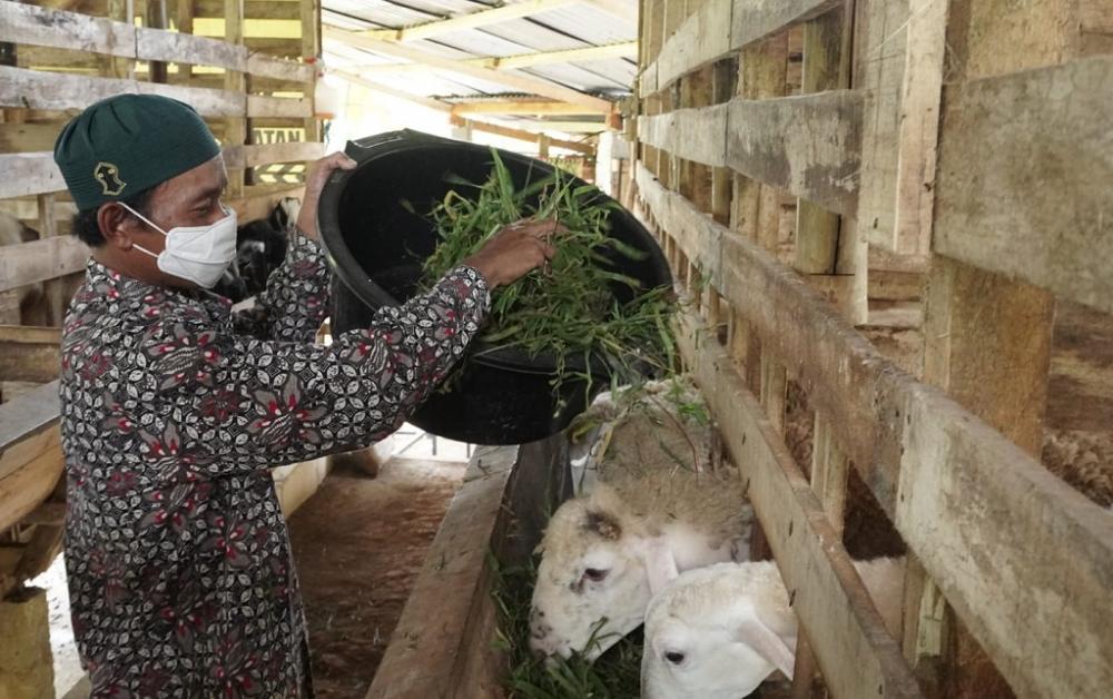 Seorang mantan narapidana Suwarno, memberi makan domba di Desa Wonomerto, Kecamatan Bandar, Kabupaten Batang, Minggu (30/1/2022). Suwarno menyampaikan, bahwa tidak menyangka setelah bebas dari lembaga pemasyarakatan (Lapas) kelas II B Kabupaten Batang mendapatkan kepercayaan mengurus sebuah peternakan domba. Selama empat bulan ini, ia mengelola peternakan yang berisi 39 hewan ternak yaitu kambing, domba, dolper dan Moreno. MC Batang, Jateng/Roza/Jumadi