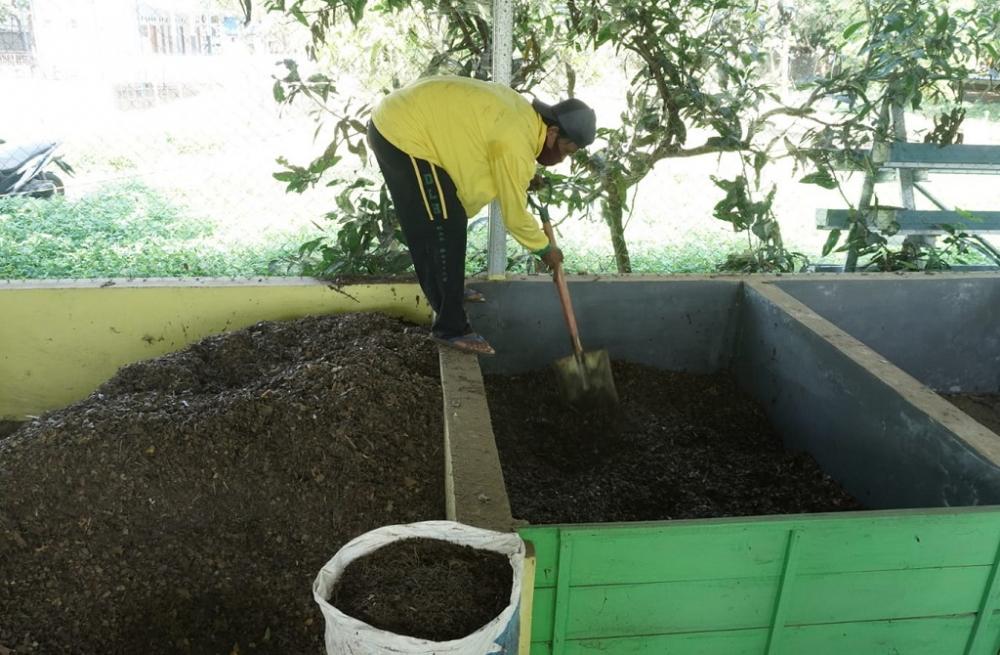 Seorang pekerja, mencampurkan daun jati halus dengan kotoran kambing dan E4 menggunakan sekop saat proses pengelolaan pupuk organik di Rumah Kompos Hutan Kota Rajawali, Kabupaten Batang, Kamis (24/2/2022). Proses pencampuran dilakukan untuk fermentasi alami daun jati menjadi pupuk organik membutuhkan waktu 7 hari dengan ditutup menggunakan plastik. MC Batang, Jateng/Roza/Jumadi