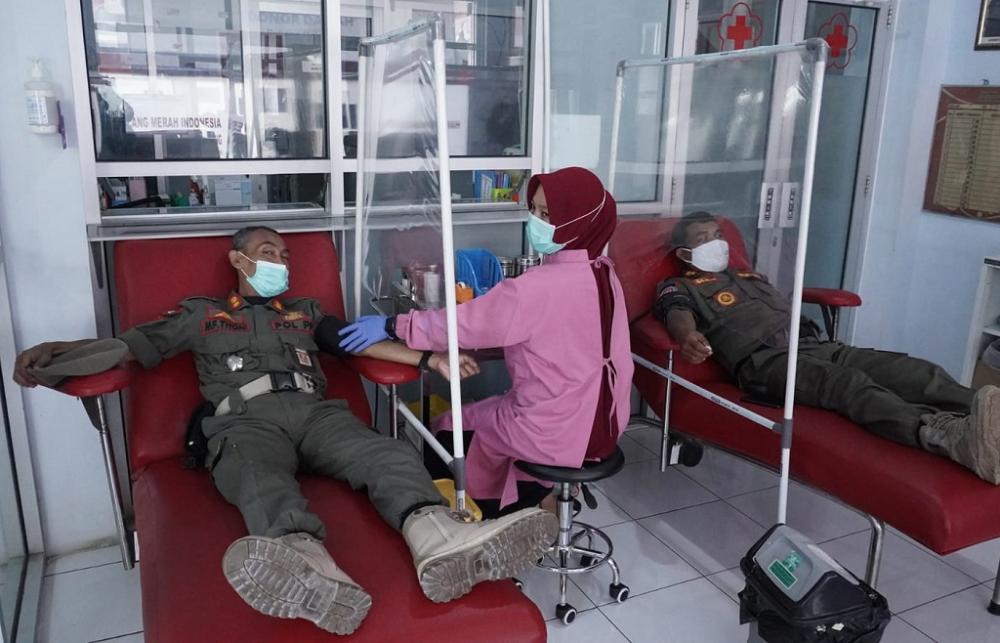 Kepala Satuan Polisi Pamong Praja (Satpol PP) Batang Muhammad Fathoni (kiri), mendonorkan darahnya dalam Peringati HUT Satpol PP Ke-72, Satlinmas Ke-60 dan Damkar Ke-102 di Kantor Palang Merah Indonesia (PMI), Kabupaten Batang, Rabu (2/3/2022). Kegiatan donor darah bersama ini dilakukan oleh seluruh anggota Satpol PP sebagai kepedulian untuk membantu sesama yang membutuhkan darah. MC Batang, Jateng/Roza/Jumadi